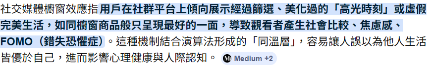 現代人使用社群媒體一直都是展現自己好的那一面,正所謂「社交媒體櫥窗效應」,同時在觀看的人心裡就會想:「啊這個人18歲在曬跑車,我在幹嘛?」;其實理智上我們都知道,網路上有太多包裝與人設。但我們就是會不自覺得想跟自己比較,這就是社群所帶來的影響進而產生焦慮。